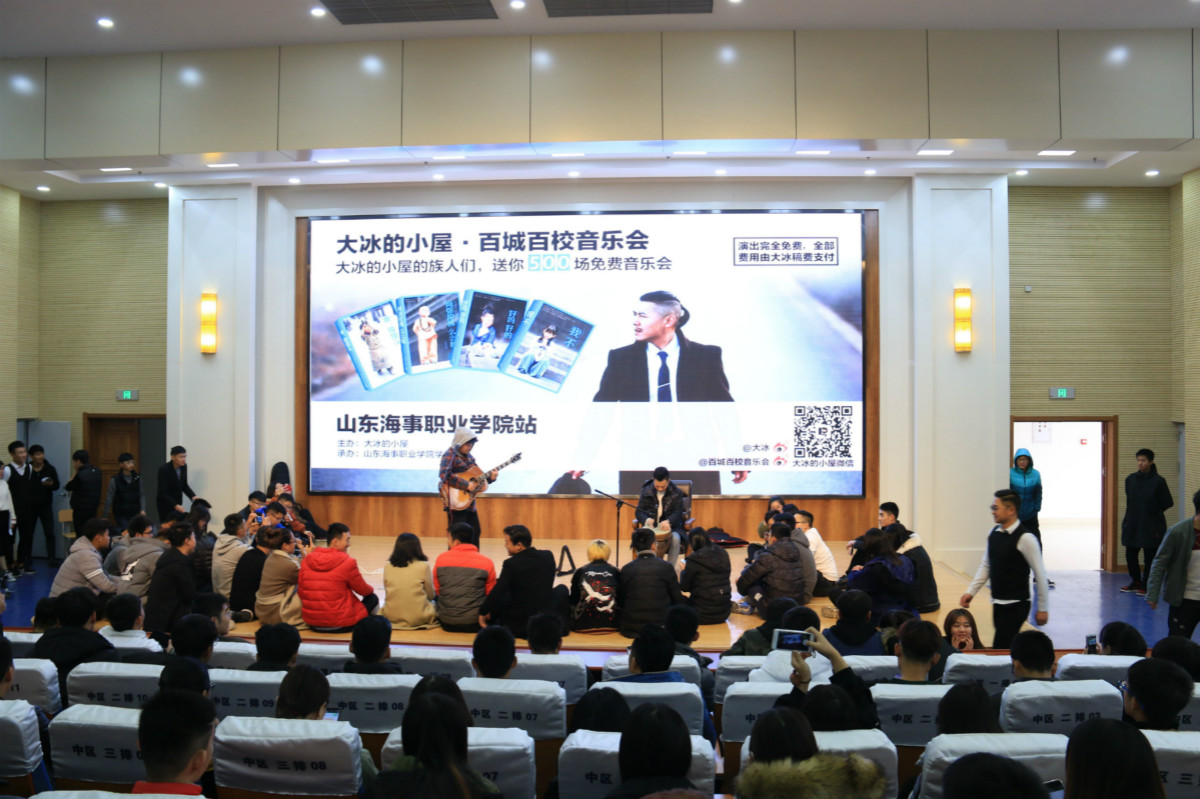 2017年11月19日下午14:30,大冰的小屋·百城百校音乐会在图书馆报告厅如期举行。音乐会现场,小猫王继阳,小屋的颜值担当张怀森用一把吉他为观众们演绎了动听的民谣,为大家带来了一场音乐的盛宴。本次活动是由大冰的小屋主办,由山东海事职业学院学生会承办。“你是我的亲生读者,我是你的野生作家,文字之外,我们或许可以一起创造更多的故事。”这是大冰微博上的一段话 ,虽然他本人不能来到现场,但是,他却用实际行动为他的亲生读者带来了温暖。