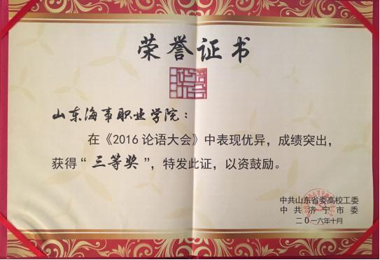 近日,山东省电视台发电致电团委,表示祝贺。由济宁市联合省委高校工委和山东电视台举办《2016论语大会》,经过两轮组织校内选拔,选拔出鲍传军、刘家鹏、张腾飞、孙贞、王善舒、贾明钰六名学生代表学院参加复赛。经过复赛选拔,18所高校进入决赛阶段。经过决赛,山海院代表队获得省三等奖。经过总决赛的激烈较量,是希望通过大学生这个迸发青春活力的群体,辐射全社会,带动优秀传统文化的传承和弘扬,让传统文化与时代精神形成共鸣,切实增强民族文化自信;进一步提升中国优秀传统文化的影响力,让全世界进一步认识《论语》。
