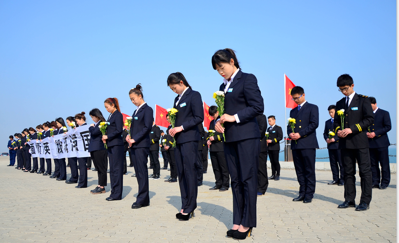 海浪拍打着海岸,溅起一朵朵浪花,海风夹杂着咸湿的气息扑面而来,学生们身穿航海服,手捧鲜花,肃穆而站……山东海事职业学院党委委员宋志刚针对航海教育的特性,结合甲午战争以来中国的历次海战,向全体师生普及了海上历史知识,让同学们明白了维护国家海洋权益、促进海上运输业发展以及建设海上国防事业的重要意义,激发了大家投身‘海上丝绸之路’建设的热情。哀乐声响起,同学们手拿“缅怀卫海英烈,建设海洋强国”的横幅,师生整齐列队,庄严肃立,面对大海向卫海英烈默哀。