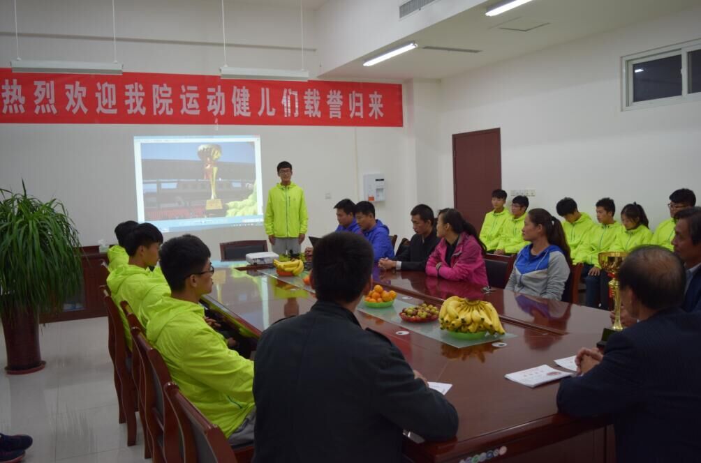 下午5:00,王院长在会议室为全体运动员召开欢迎会,整个会议由张院长主持,张锡功处长,运动员代表和体育老师代表分别发表讲话,向王院长汇报了整个赛事激动人心的过程.最后王院长对我院代表队进行了高度评价,并指出此次取得的成绩值得全院师生乃至整个潍坊体育界骄傲。