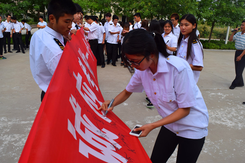 宣誓大会上,学生会副主席张钰涵同学带领全体同学进行忠诚应考誓词宣读,现场声声铿锵有力,气氛严肃而热烈,诚实应考的观念深入人心。最后,张锡功处长带领全体同学在“忠诚应考做一个诚实守信的当代大学生”条幅上签下自己的姓名,现场同学争先恐后郑重地签名,表达自己忠诚应考,践行社会主义核心价值观的共同愿望。