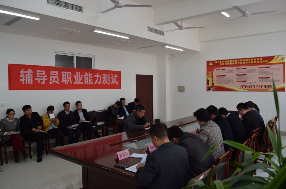 为进一步提升我院辅导员职业能力和专业素养,引导广大辅导员坚定职业理想,明确岗位要求,提高服务水平,全面提升辅导员队伍的整体素质,完善辅导员管理制度和考核制度,促使其更好地开展学生教育管理工作。在我院全体辅导员参加中国网络干部教育学院第二期辅导员培训临近结业之际,团委学生处于2015年3月30日下午在二楼会议室组织开展了辅导员职业能力测试¬¬¬班情熟知。院领导仉继航担任本次测评主考官,各系、实训中心主管学生工作负责人担任考官,团委学生处处长张锡功主持了测评的全过程。