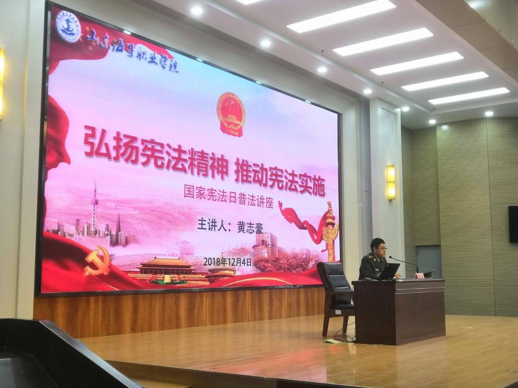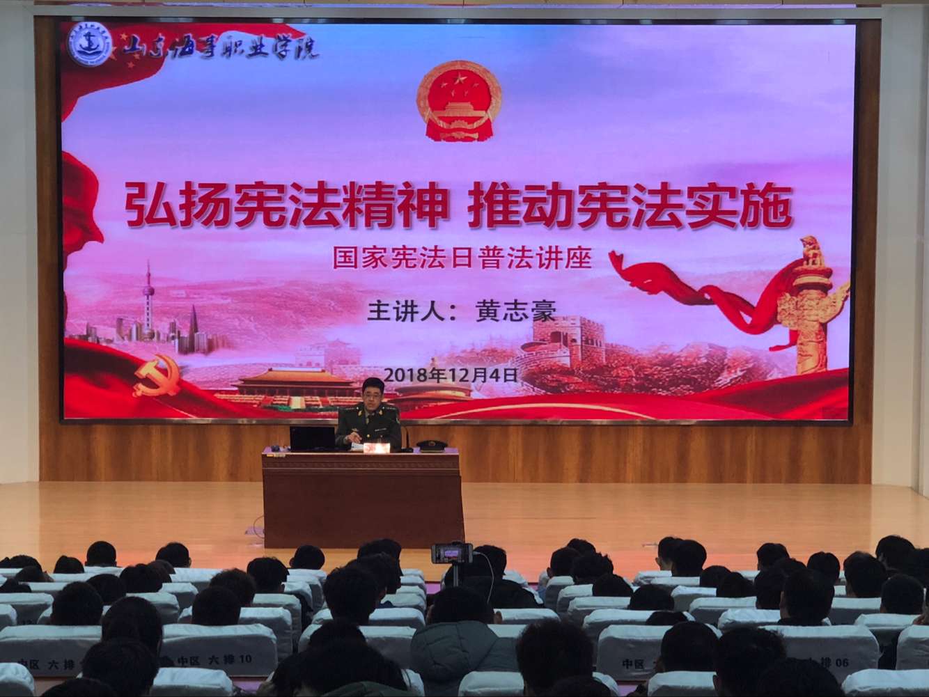 为培养学生学法、知法、守法、护法的法治意识,营造校园法治宣传氛围,12月4日下午,山东海事职业学院开展了“弘扬宪法精神,推动宪法实施”的知识讲座,本次讲座的主讲人是滨海区央刑警大队队长黄志豪,学院团委书记李雪、安保处处长孟凡明出席了本次活动。