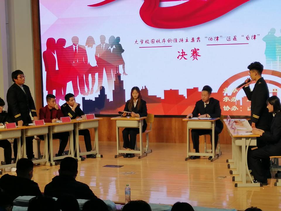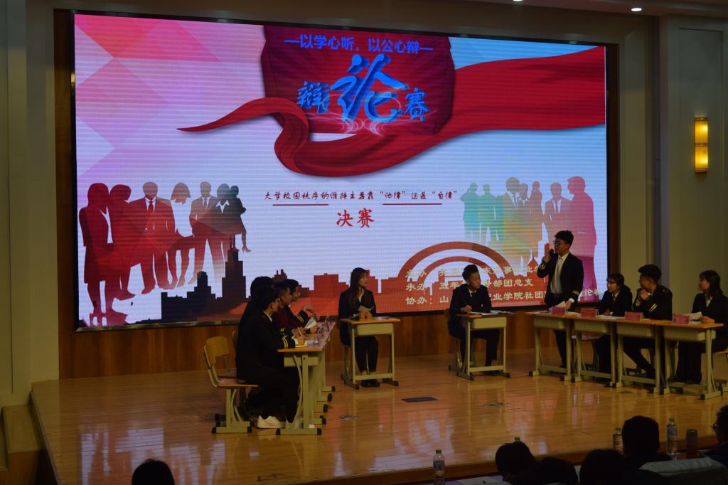 此次辩论赛的辩题是:大学校园秩序的维持是靠自律还是他律。正方的观点是靠自律,反方的观点是靠他律。双方选手在立论,驳立论,智辩等各个环节中思路清晰,引经据典,字字珠玑,比赛进行的激烈又精彩。在自由辩论环节中,双方辩手展开了更深层次的辩论。正反双方针锋相对,互不相让,妙语连珠又有理有据,一次次将比赛推向高潮。经过立论陈词、攻辩阶段、攻辩小结、自由辩和总结陈词这五个环节的激战,最终,作为正方参赛的辩论赛社团获得冠军,反方五年制大专部获得亚军,航空学院获得季军。