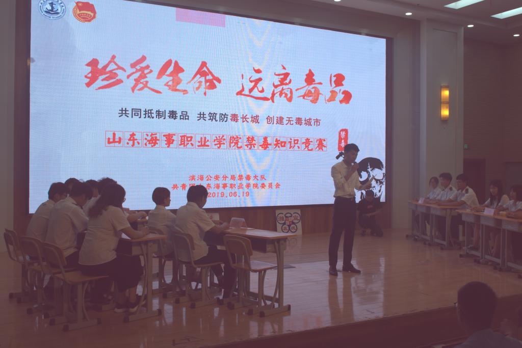 为贯彻习近平总书记等党中央领导同志对禁毒工作的指示精神,让学生了解毒品的危害,知晓禁毒常识,提高学生的禁毒意识,6月19日,在我院图书馆报告厅,滨海区禁毒办与我院联合开展了一场禁毒知识竞赛。此次出席知识竞赛活动的评委有:滨海区禁毒委委员、禁毒办副主任、公安分局刑警大队教导员、禁毒大队主要负责人付启善同志,禁毒大队民警于振中同志、王东东同志,滨海区人民检察院二级检察官冯耀法同志,团委副书记郑晓龙同志。