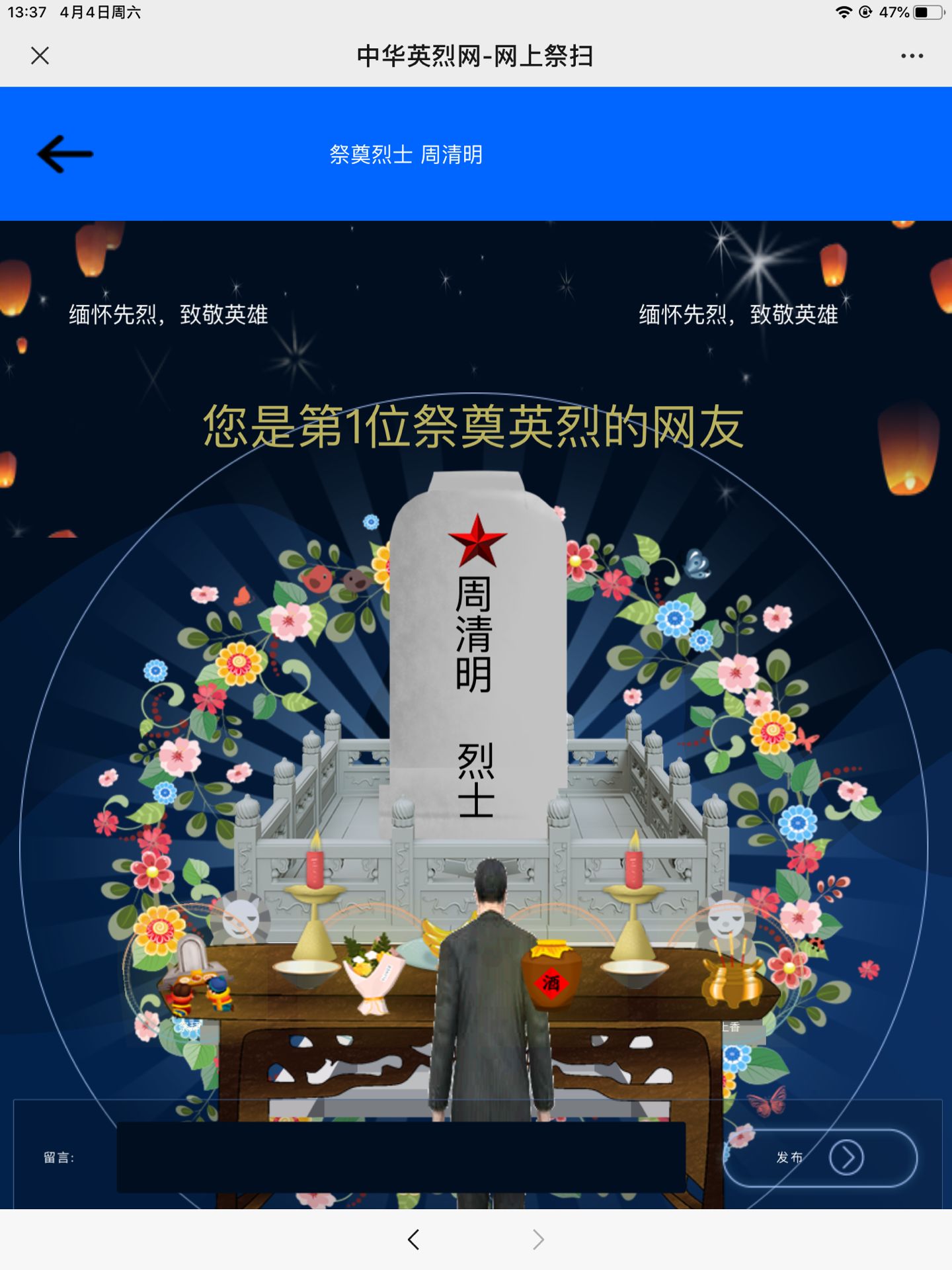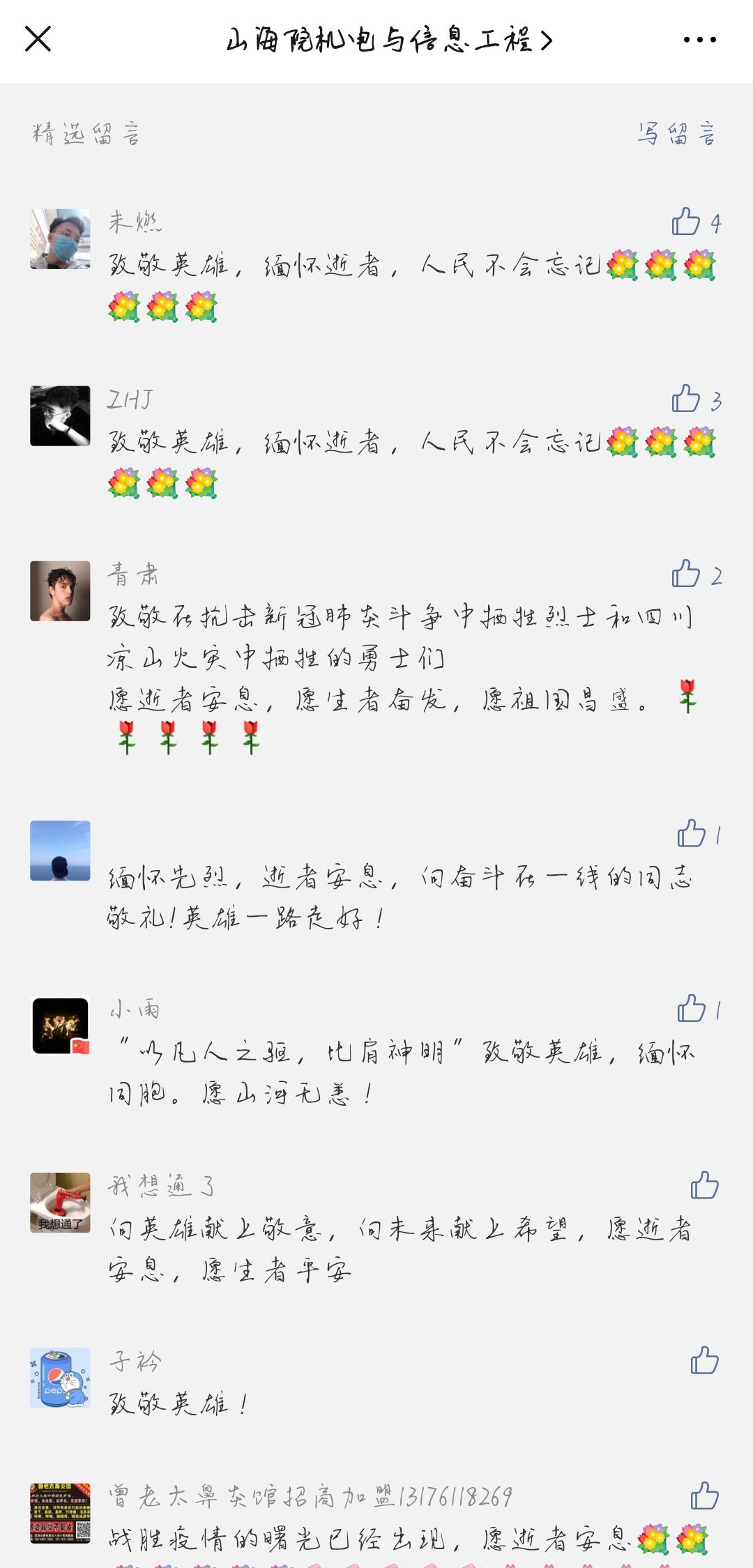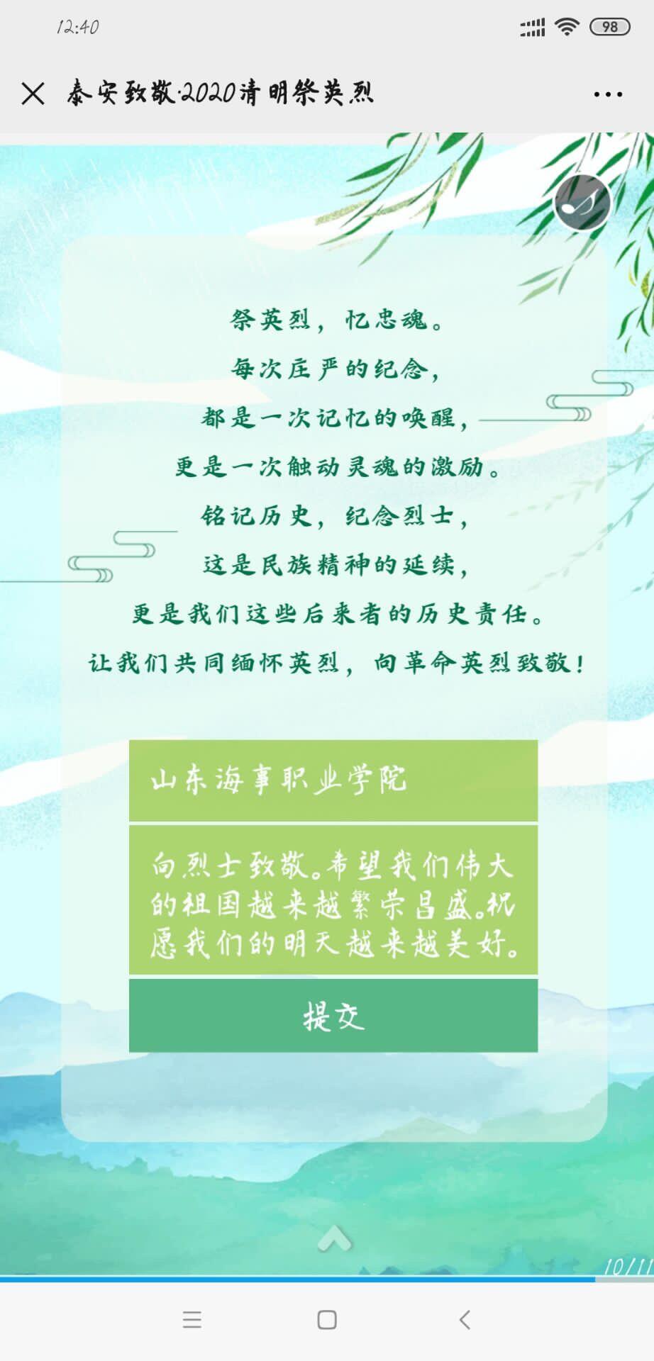 清明节是祭奠逝者、缅怀先烈的传统节日,为深入学习贯彻习近平总书记关于防控新冠肺炎疫情和英烈褒扬的重要指示精神,认真落实疫情防控各项措施,深入做好疫情防控期间英烈褒扬纪念工作,通过畅通网络平台,推行网上祭扫方式,积极营造崇尚英烈、学习英烈的浓厚氛围,山东海事职业学院团委发出以“致敬--2020清明网上祭英烈”为主题号召广大同学参与网上祭扫活动,倡议同学们在非常时期,通过网上祭奠英烈,向先贤先烈鞠躬献花,抒写感言寄语。