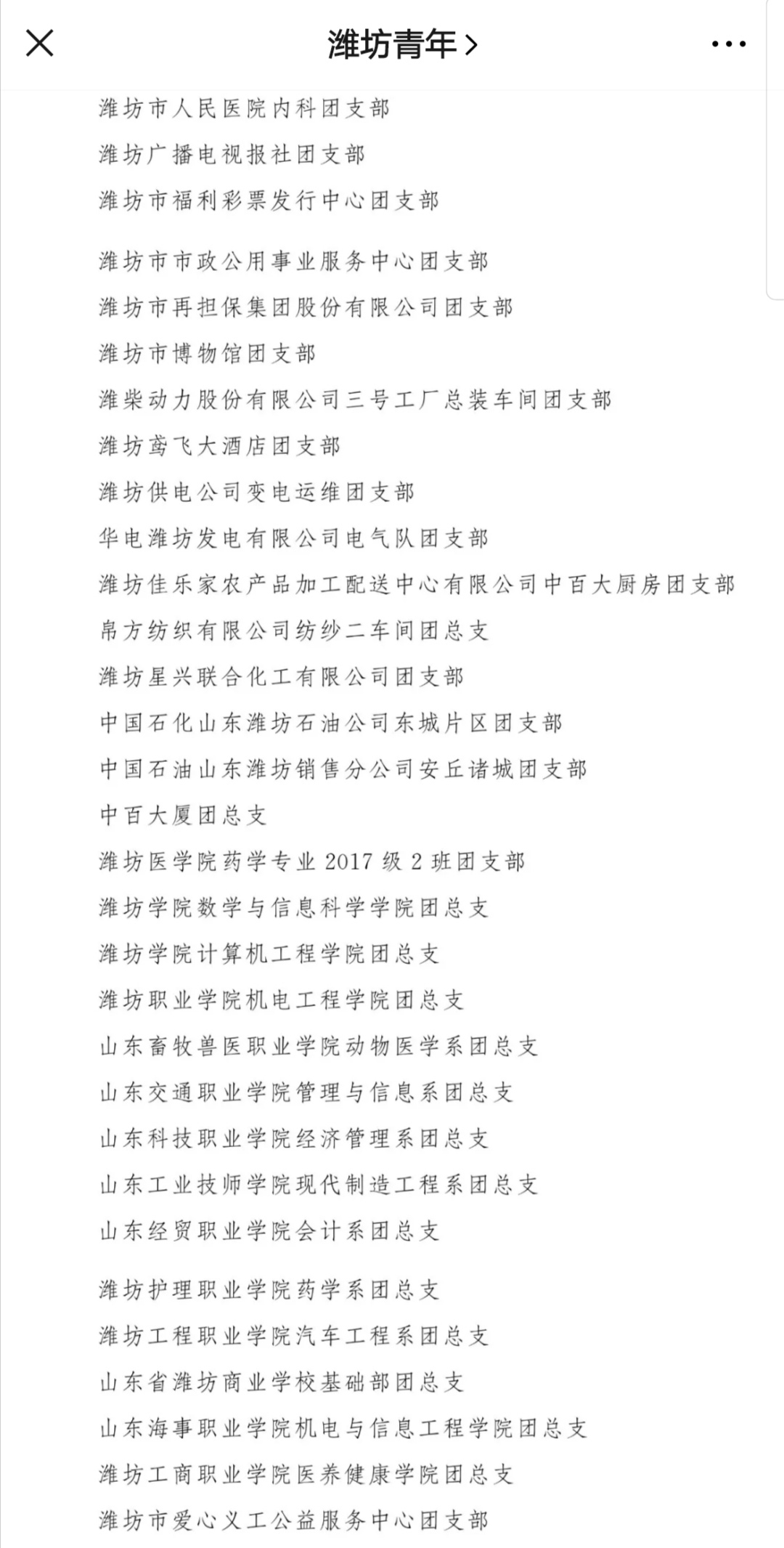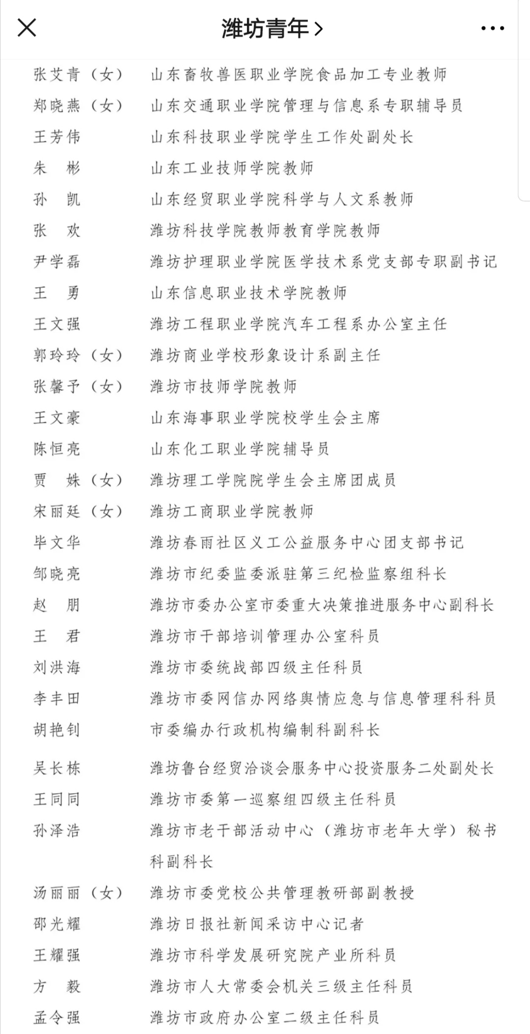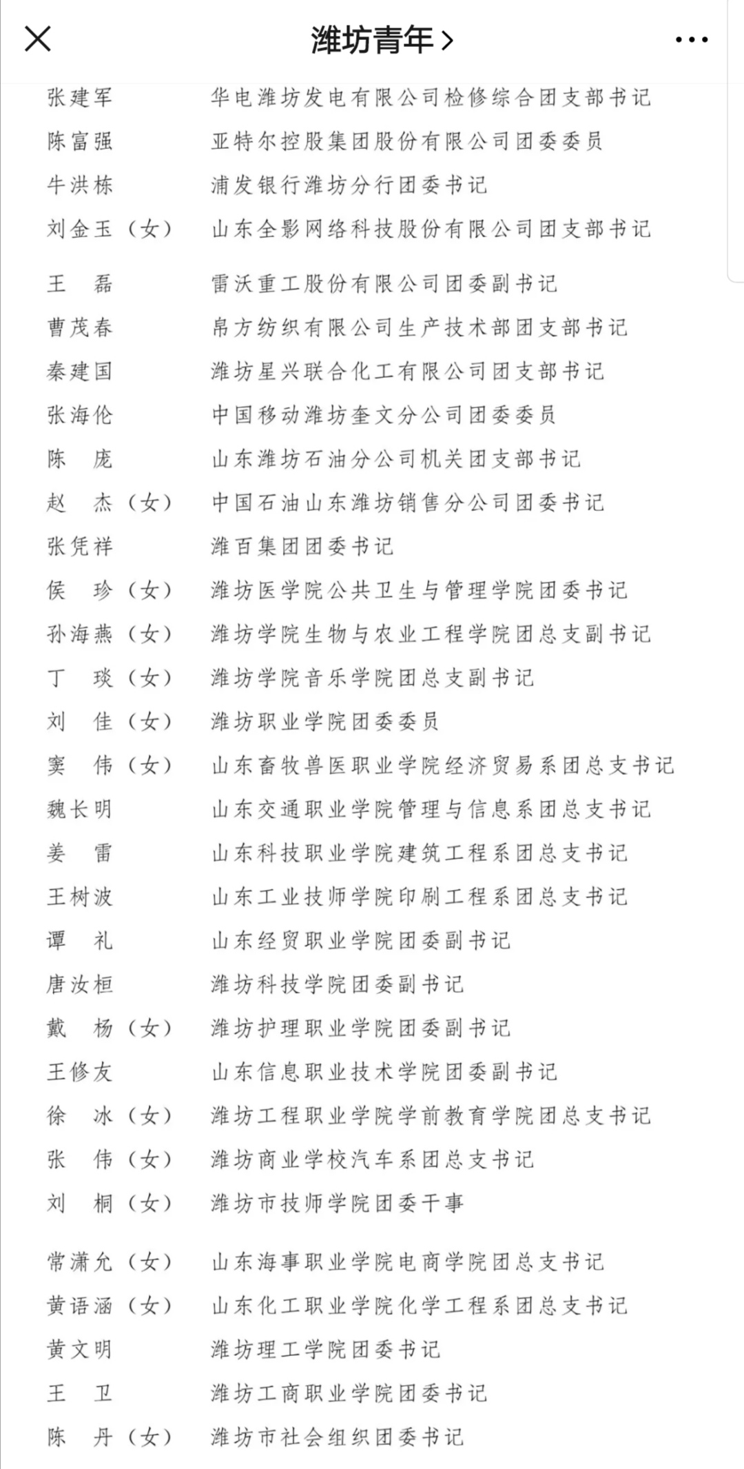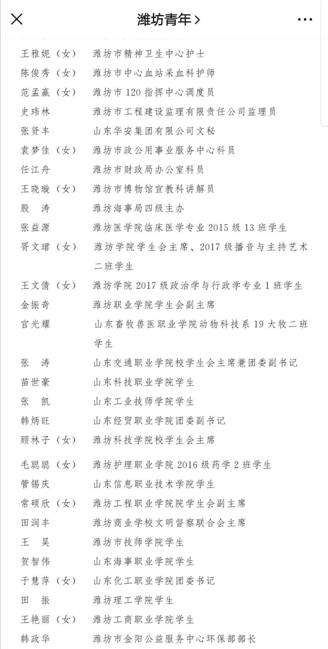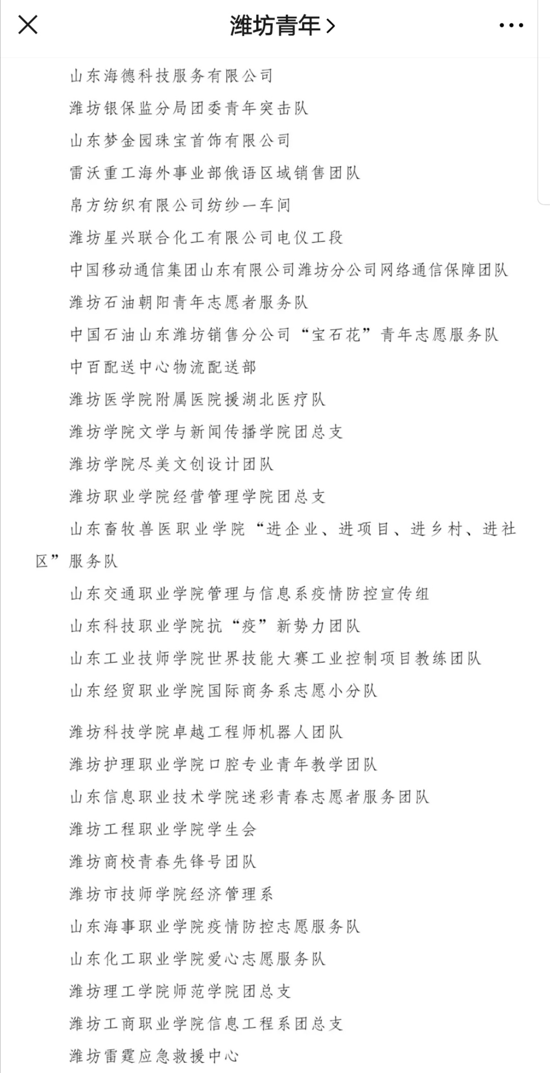 在团市委组织的2019年度五四荣誉称号申报中,我校疫情防控志愿服务队获得“潍坊市青春担当好团队”荣誉称号,机电与信息工程学院团总支获得“潍坊市五四红旗团组织”荣誉称号,电商学院团总支书记常允潇获得“潍坊市优秀共青团干部”荣誉称号,王文豪同学获得“潍坊市青春担当好青年”荣誉称号,贺智伟同学获得“潍坊市优秀共青团员”荣誉称号。