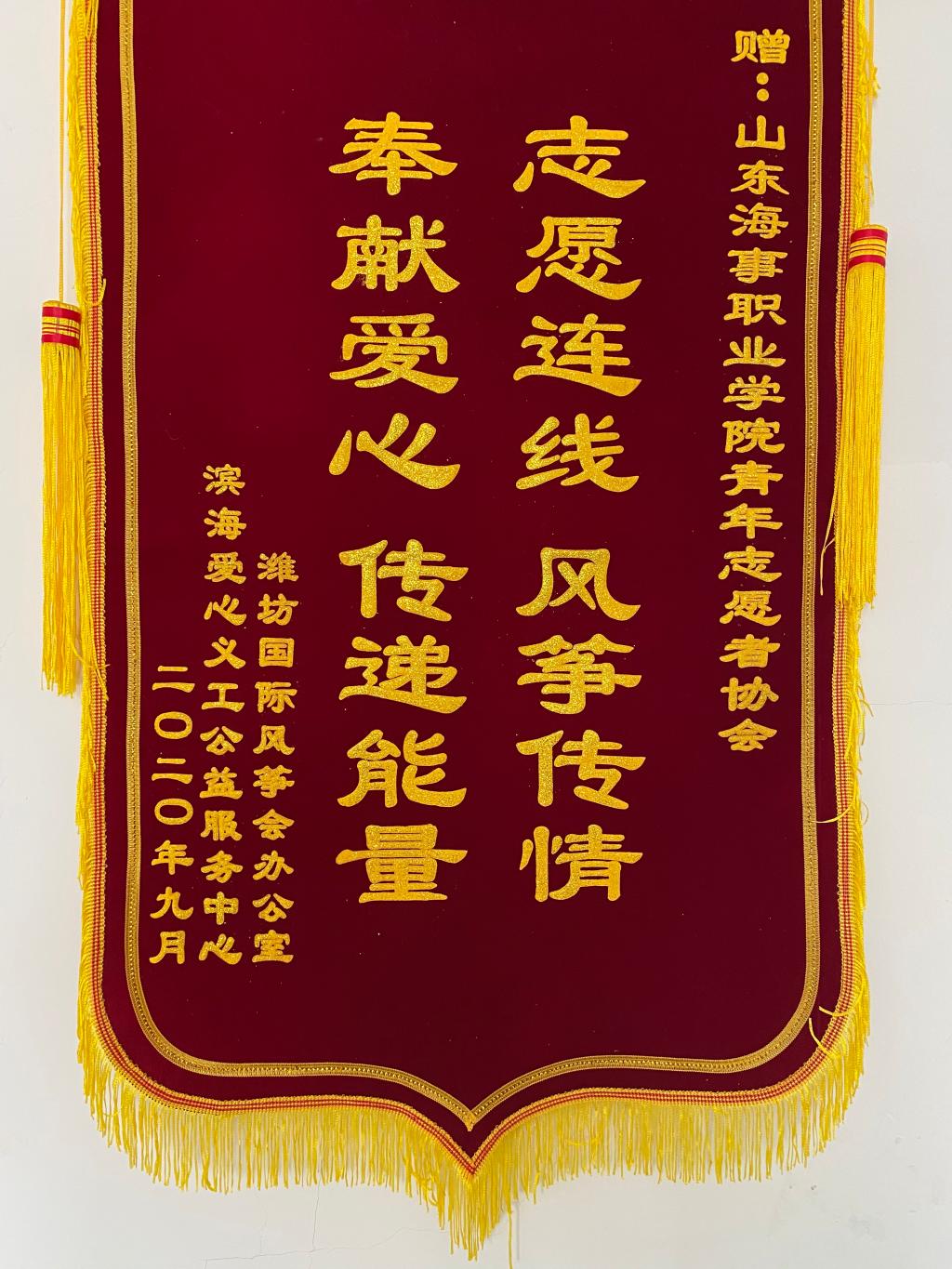 10月7日下午,我校团委收到了来自潍坊国际风筝会办公室、滨海爱心公益服务中心送来的锦旗,锦旗内容为“志愿连线风筝传情奉献爱心传递能量”,以此感谢我校组织青年志愿者积极参与第三十七届潍坊国际风筝会。