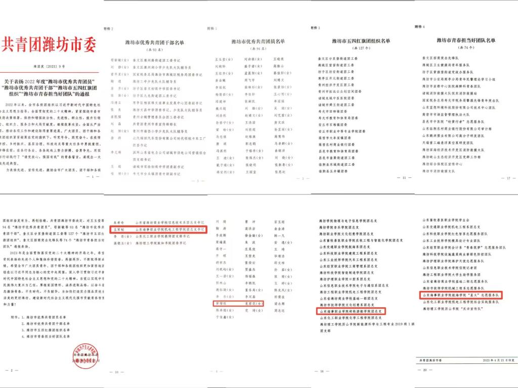 近日,共青团潍坊市委下发《关于表扬2022年度“潍坊市优秀共青团员”“潍坊市优秀共青团干部”“潍坊市五四红旗团组织”“潍坊市青春担当团队的通报》,我校港航管理学院黄增旺、基础部庞君花荣获“潍坊市优秀共青团员”称号;机电工程学院团总支书记王军韬荣获“潍坊市优秀共青团干部”称号;邮轮游艇学院团总支荣获“潍坊市五四红旗团组织”称号;航海学院“星火”志愿服务队荣获“潍坊市青春担当好团队”称号。