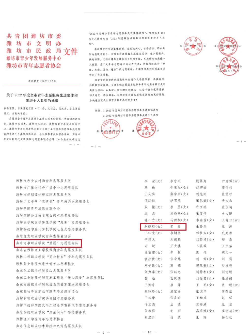 近日,共青团潍坊市委、潍坊市文明办、潍坊市民政局、潍坊市青少年发展服务中心、潍坊市青年志愿者协会联合发布了关于《2022年度全市青年志愿服务先进集体和先进个人典型》的通报,山东海事职业学院航海学院“星愿”志愿服务队荣获“潍坊市青年志愿服务先进集体”荣誉称号,京东·新迈尔电商学院团总支书记赵晓琨、机电工程学院学生郭泰荣获“潍坊市青年志愿服务先进个人”荣誉称号。