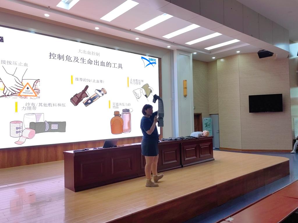 为拓展同学们的课外知识面,并掌握CPR急救知识和技能,讲师周巧以模型实操形式,细致讲解并实操演示了心肺复苏术的操作方法以及海姆立克急救法等急救知识,详细介绍了校园常见外伤的紧急处理方法。在讲师的专业指导下,许多同学第一次亲身体验了操作心肺复苏术的全过程。