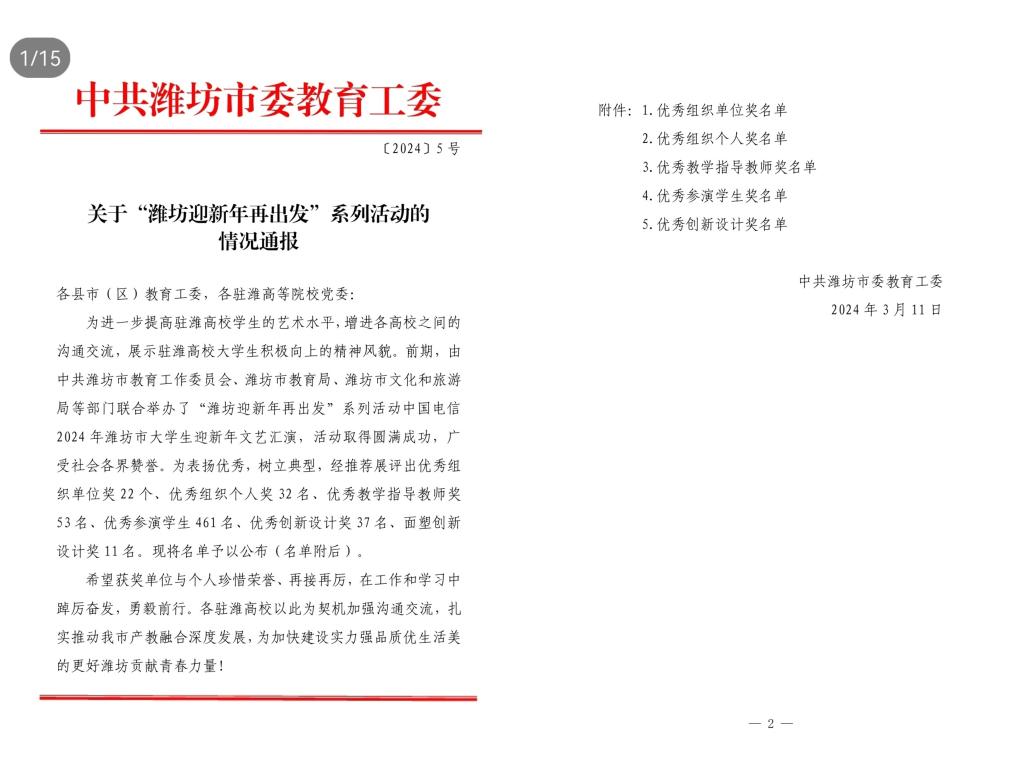 在此次“潍坊迎新年再出发”系列活动中,我校师生始终保持着饱满的热情和高昂的斗志,充分展现了我校师生团结拼搏、奋发向上的精神风貌,通过精彩纷呈的节目表演向潍坊人民展现了学校的专业特色和教学成果。