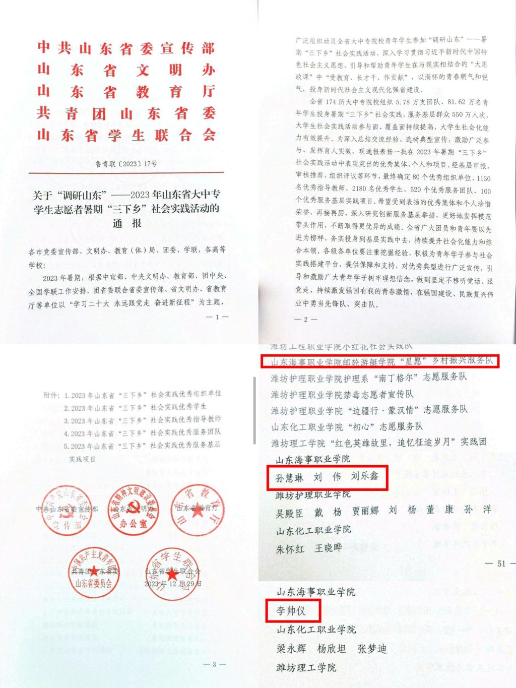 近日,共青团山东省委印发《关于“调研山东”——2023年山东省大中专学生志愿者暑期文化科技卫生“三下乡”社会实践活动的通报(鲁青联〔2023〕17号》,我校荣获多项荣誉。其中,邮轮游艇学院“星愿”乡村振兴服务队荣获“优秀服务团队”;孙慧琳、刘伟、刘乐鑫荣获“优秀指导教师”;李帅仪荣获“优秀学生”荣誉称号。