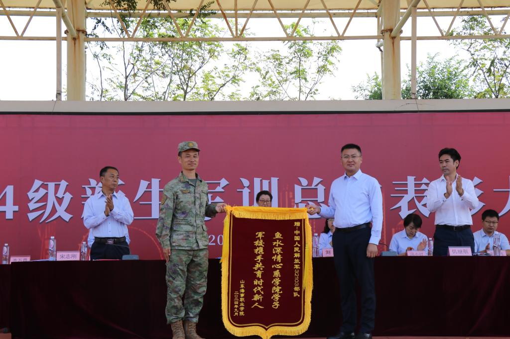 副校长仉继航宣读《山东海事职业学院关于表彰2024级新生军训优胜连队、优秀组织连队、军训优秀标兵的决定》,参会领导为获奖单位和个人进行颁奖。