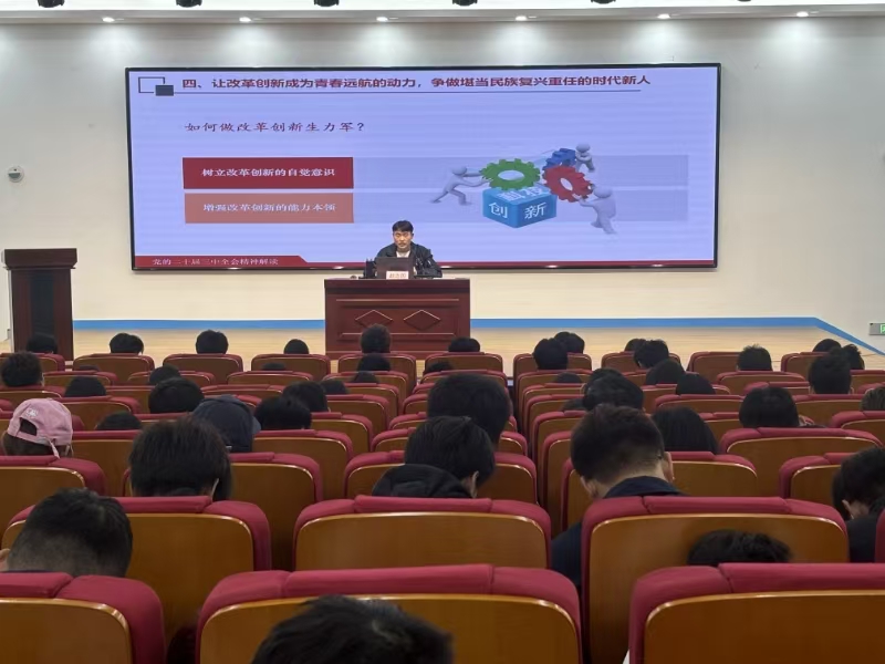 10月23日,学校在行政楼报告厅举行“青马工程”暨学生骨干培训班学习贯彻党的二十届三中全会精神宣讲报告会,各班班长、团支书300余人参加,马克思主义学院教师赵志国作宣讲报告。