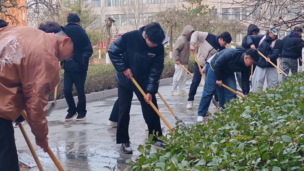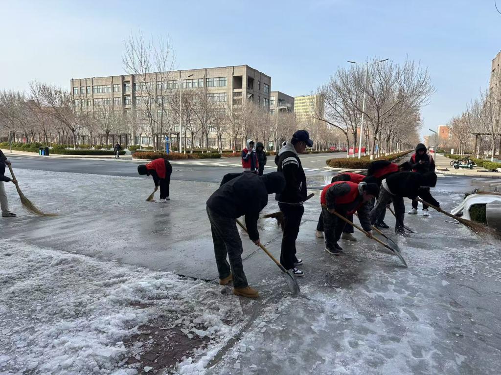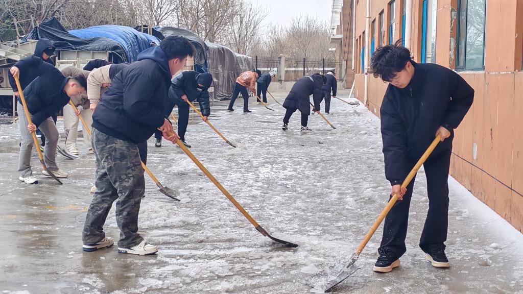 近日低温、降雪致使校园多处结冰,路面湿滑,给师生出行带来极大不便。主干道冰层厚滑,清理难度大,同学们分组协作,用铁锹铲碎冰层,扫帚清扫碎冰,双手冻红也不停歇。