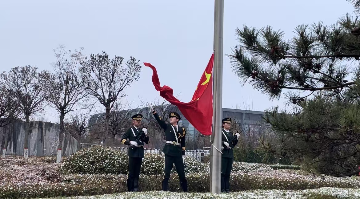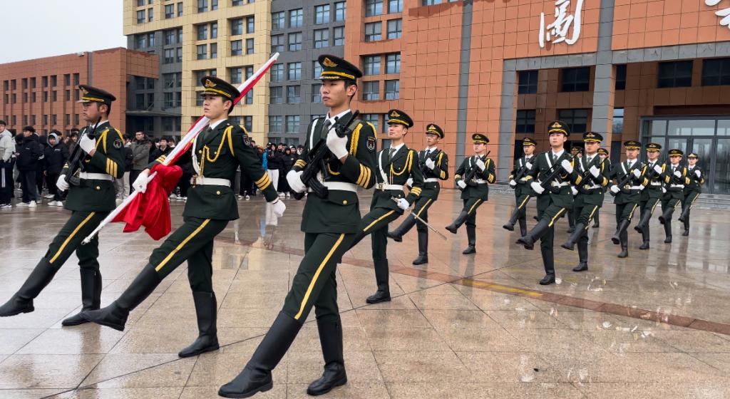 早上7点整,升旗仪式正式开始。国旗护卫队成员迈着整齐而坚定的步伐来到了国旗台下。伴随着雄壮豪迈的国歌,鲜艳的五星红旗冉冉升起。全体奏唱国歌、行注目礼,庄严肃穆。