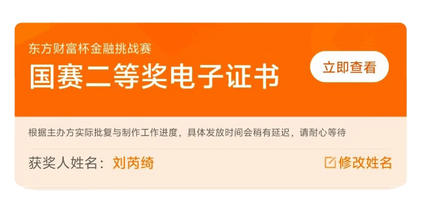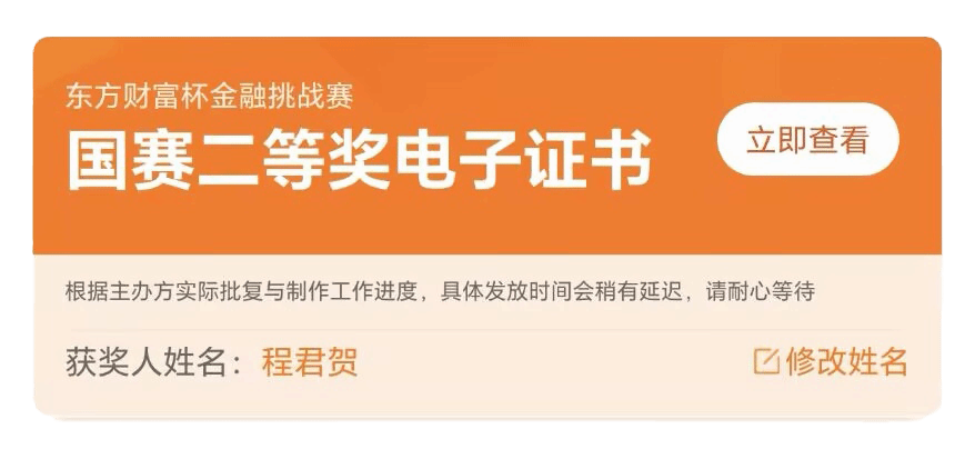 近日,第十一届“东方财富杯”全国大学生金融挑战赛全国总决赛圆满落幕,我校学子在全国三百万参赛者中脱颖而出,斩获国赛二等奖:其中,邮轮游艇学院2024级烹饪工艺与营养专业程君贺、机电工程学院2024级电气自动化专业刘芮绮,两名学子分别荣获国赛二等奖,彰显了山海学子在全国性跨学科实践赛事中的过硬实力与卓越风采。