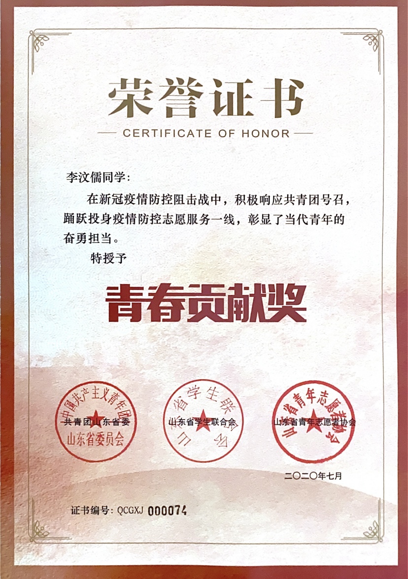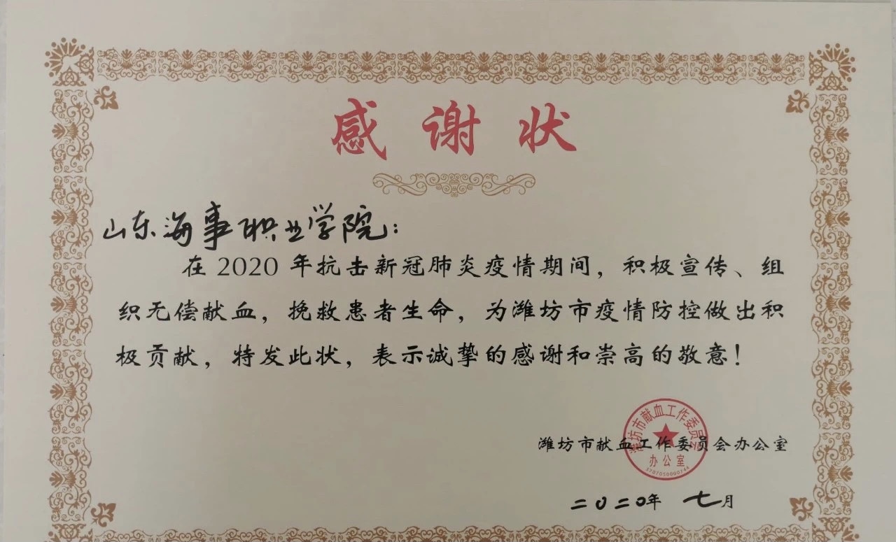 我校2019级安全技术与管理专业的李汶儒同学在新冠疫情防控阻击战中,积极响应共青团号召,踊跃投身疫情防控志愿服务一线,荣获山东省大学生“青春贡献奖”荣誉称号;2020年受新冠疫情影响,血液量告急,我校1077名师生参与到无偿献血活动中来,献血总量达到323100毫升,收到了潍坊市中心血站的感谢状;在第十二届山东省大学生科技节暨“辰华科技”杯第二届山东省大学生装备制造业创新大赛中,我校“机电与信息工程学院代表队”获得一等奖;我校青年志愿者协会被评为“滨海义工优秀团体奖”,其中,2020年度有5名学生被评为“大学生优秀义工”;承办滨海大学生首届公益年会。在毕业生团关系转接中,我校学社衔接率达到98%,受团市委表扬。