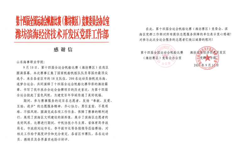 近日,我校收到第十四届全国运动会帆船比赛(潍坊赛区)竞委会、滨海区党群工作部的感谢信。竞委会在信中对我校32名志愿者在帆船比赛期间的服务工作给予了高度肯定,并对我校大力配合十四运志愿者工作表示了感谢。