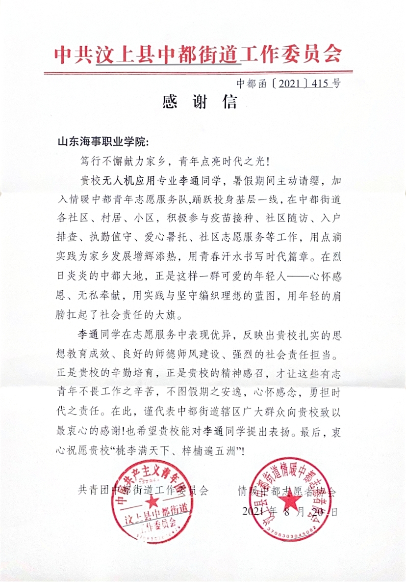 9月20日,学校收到了一封来自山东省济宁市汶上县中都街道的感谢信,信中对学校2019级无人机应用技术学生李通在暑假期间“舍小家,顾大家”的奉献精神和作为志愿者的优异表现进行肯定和赞扬,并对我校培养出如此勇于担当奉献的学子表示感谢。