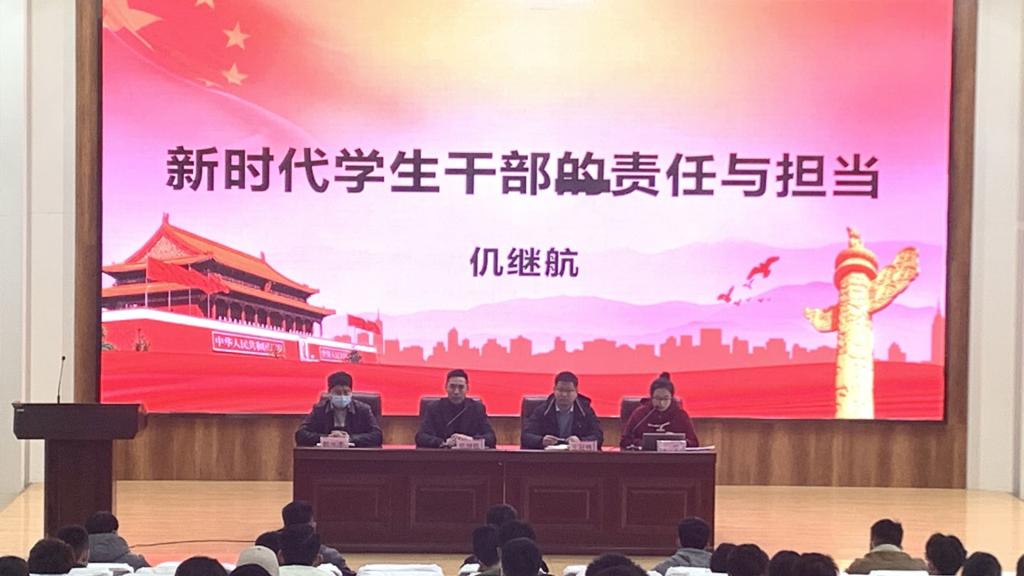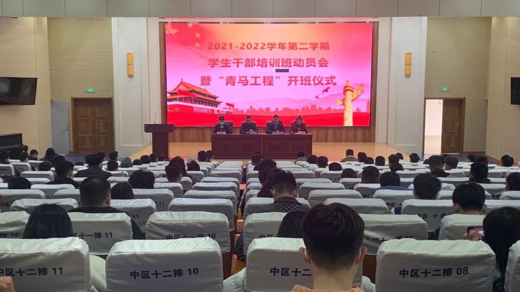 2月28日下午,学校2021-2022学年第二学期学生骨干培训班动员会暨“青马工程”开班仪式在图书馆报告厅举行,副校长仉继航、学生工作处副主任王冠伟、学生工作主任助理郭海洋出席,由团委书记刁宁主持。