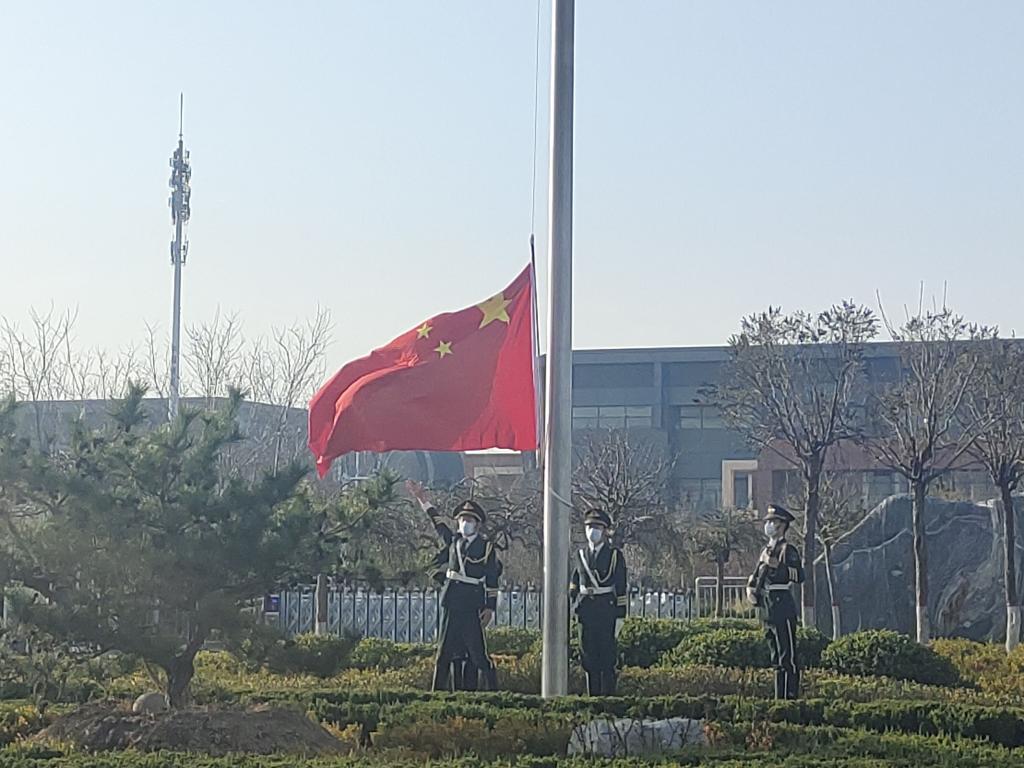 此次升旗仪式采用视频直播方式进行。主持人宣布“出旗”,我校国旗护卫队护送国旗,迈着坚定有力的步伐走向升旗台,伴随着慷慨激昂的国歌声,庄严的五星红旗缓缓升起。全体师生肃然起立,高唱国歌,共同见证这庄严神圣的时刻!