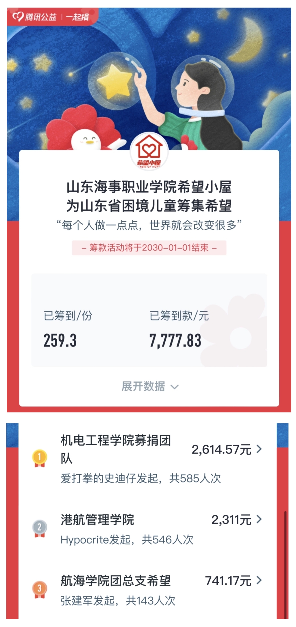 为推进“希望小屋”儿童关爱项目,全力做好“希望小屋”建设、帮扶工作,用实际行动践行责任担当。5月20日,腾讯公益共建山东海事职业学院希望小屋项目正式启动。截至今天已有1700余人通过线上途径参与捐款,筹集250余份,筹款已超过7700余元。
