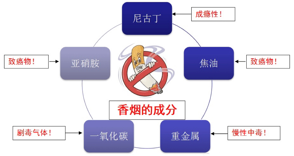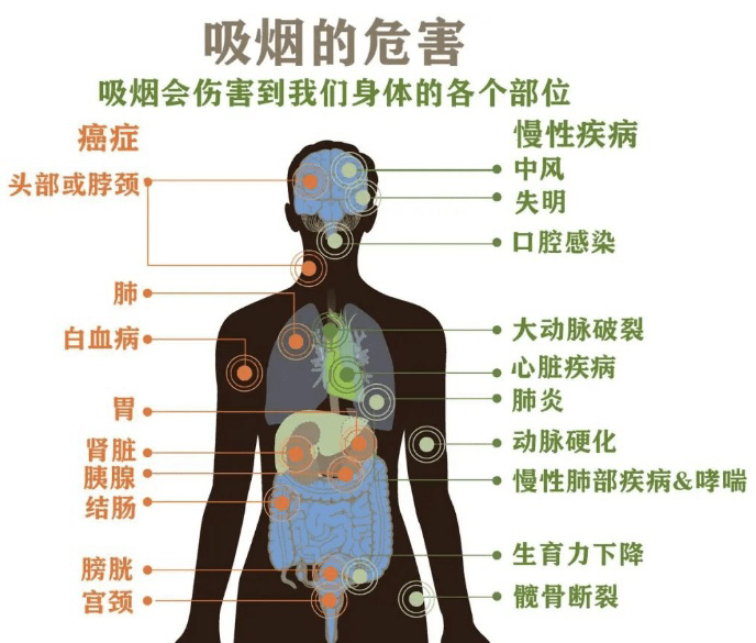 吸烟与恶性肿瘤:烟草烟雾中含有至少69种致癌物,当人体暴露于这些致癌物中时,致癌物会引起体内关键基因发生永久性突变并逐渐积累,正常生长调控机制失调,导致恶性肿瘤发生。有充分证据说明,吸烟可导致肺癌、喉癌、膀胱癌、胃癌、宫颈癌、卵巢癌、胰腺癌、肝癌、食管癌、肾癌等,吸烟量越大,吸烟年限越长,疾病的发病风险越高。有证据提示,吸烟可以增加急性白血病、鼻咽癌、结直肠癌、乳腺癌的发病风险。戒烟可明显降低这些癌症的发病风险,并改善疾病预后。