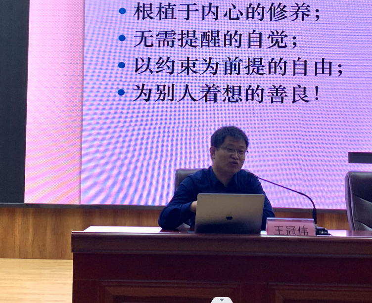 仪式结束后,学生处副处长王冠伟以“榜样的力量”为主题开展集中授课。王处长讲到同学们要提高自己的价值判断水平,做出正确的价值选择。其次,要保持良好的心态,正确处理好与同学之间的关系,牢记为同学服务的宗旨,从同学中来、到同学中去,认真倾听广大同学诉求,积极畅通校园沟通协调渠道,实心实意帮助同学解决困难。