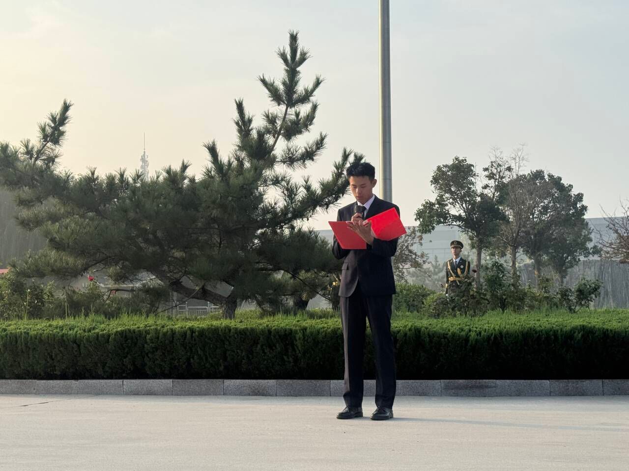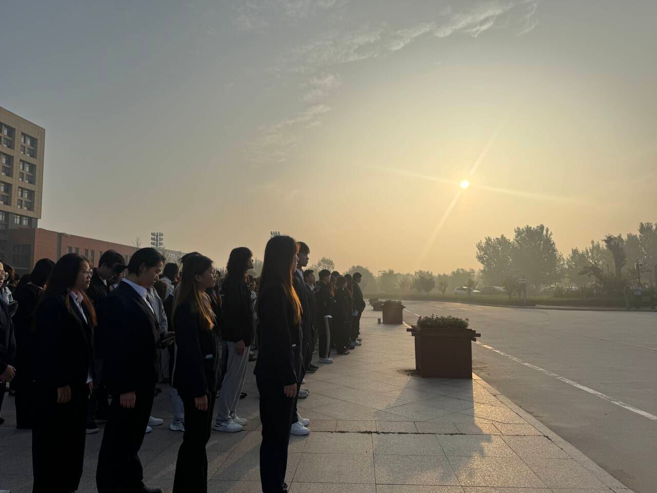 上午7时,伴随《义勇军进行曲》,国旗护卫队迈着铿锵步伐护送五星红旗入场。全体师生肃立注目,国旗冉冉升起,众人齐唱国歌,嘹亮歌声回荡校园,传递对祖国的真挚祝福。