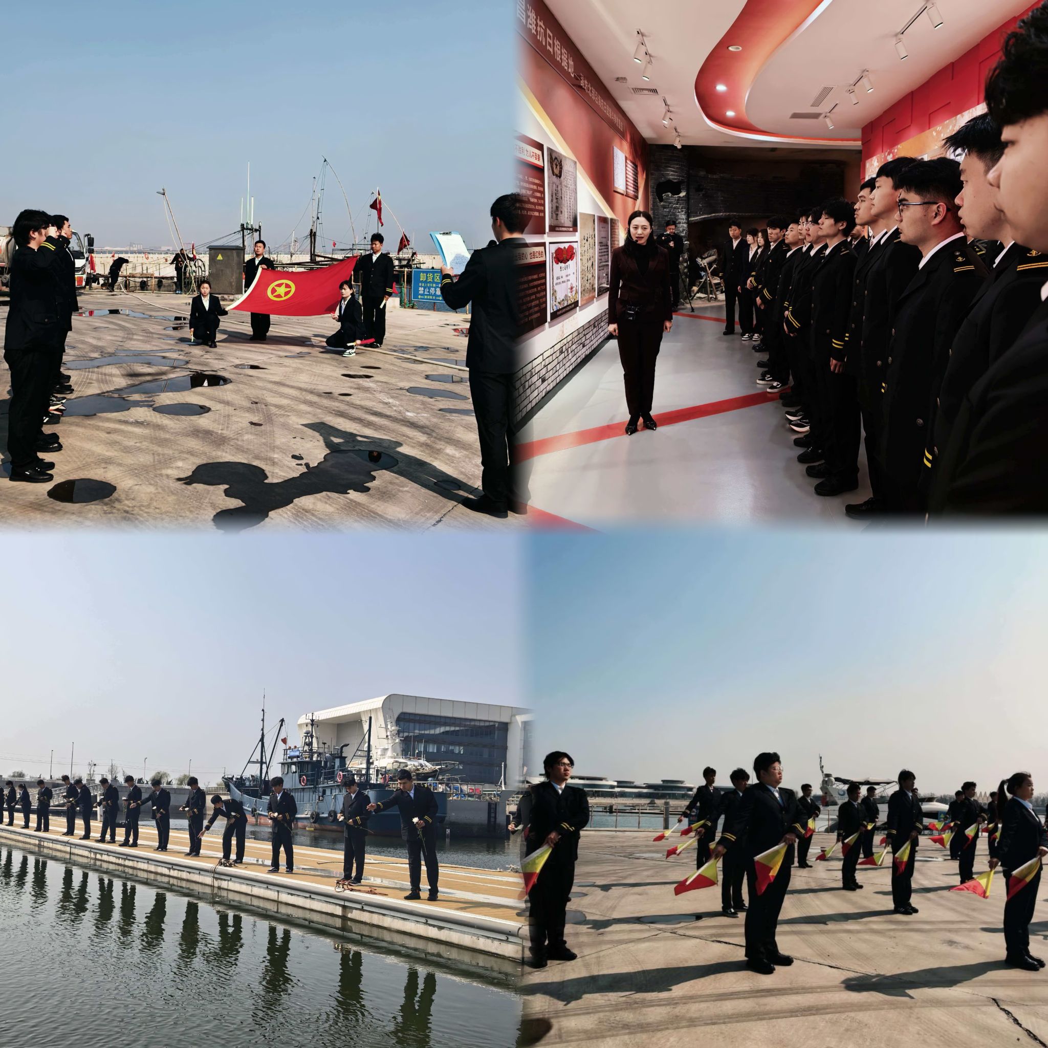 学校立足海事特色,厚植青年家国情怀,举行庄重海祭仪式。全体师生面向大海肃立默哀,汽笛鸣响震长空,白花逐浪寄深情,深切悼念为海疆安宁、家国安宁献身的革命先烈。团总支书记鞠凯诵读祭文,字字铿锵追忆先烈浴血守疆的峥嵘岁月,让红色信仰在海风中传递。全体团员面向团旗重温入团誓词,誓言响彻云霄,彰显海事青年“强国有我” 的坚定担当。旗语队以精准利落的动作,展演“强国有我,请党放心”“强国复兴有我”等旗语,用专业语言传递守护海疆的赤诚,展现海事学子过硬本领与昂扬风貌。随后,师生走进“奋进滨海展馆”,从历史图片、实物展品中感悟海疆建设成就,坚定“向海图强、青春报国”的使命追求。