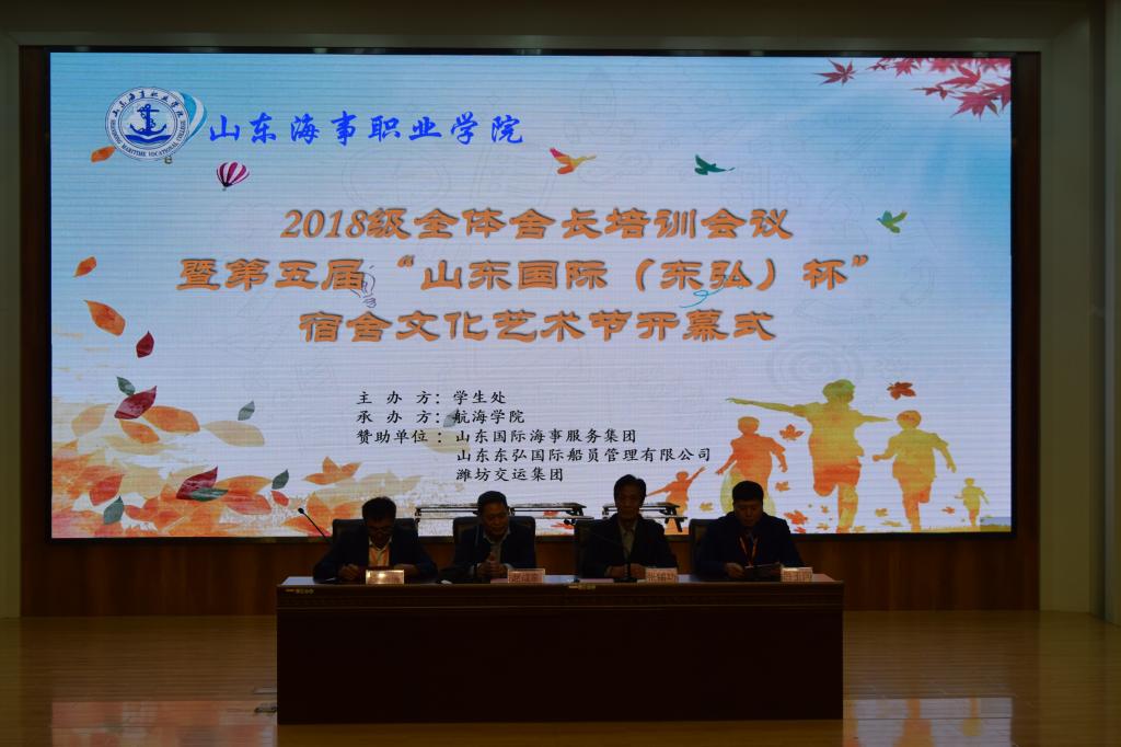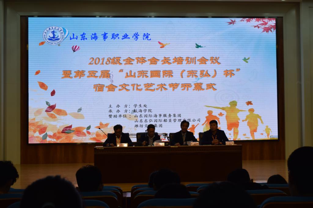 10月25日下午,山东海事职业学院第五届“山东国际(东弘)杯”宿舍文化艺术节开幕式在图书馆一楼报告厅隆重举行,学生处长张锡功、山东东弘国际船员管理有限公司副总经理赵成家、航海学院团总支书记王涛涛、全院辅导员老师及2018级宿舍长参加开幕式。本次开幕式由学生处副处长吕玉国主持。