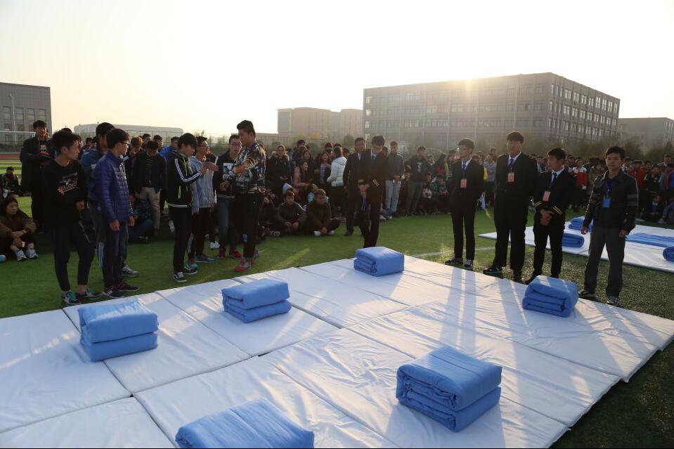 为加强精神文明建设,提高学生内务标准,提升学生综合素养。11月11日下午15:30,学院在运动场举行新生叠被大赛。本次大赛从每位辅导员老师所辖宿舍中随机抽取两个参赛,比赛分7轮进行。比赛开始前,学院公寓管理委员会成员已经按照要求在指定区域摆好床单,为比赛做好了准备。