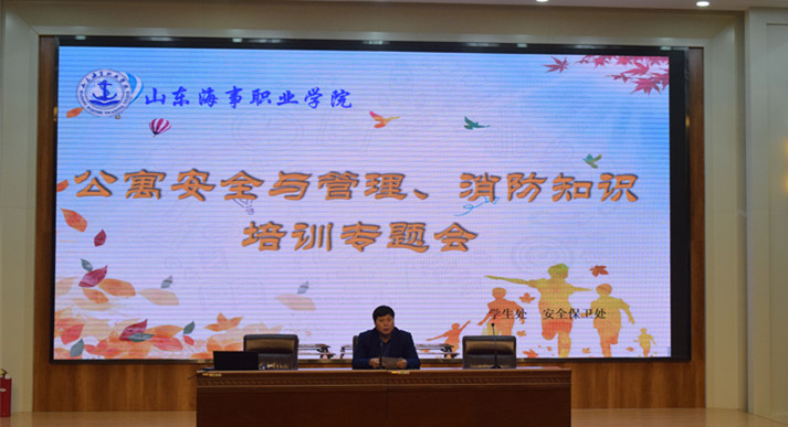 为了进一步增强同学们的安全意识,提高学生应急自救能力,筑牢校园消防安全防火墙,11月22日下午,我院邀请潍坊防火中心教员朱理鑫为我院学生做消防安全知识培训,学生处副处长吕玉国、安保处副处长孟凡明出席会议,我院全体宿舍长参加培训。