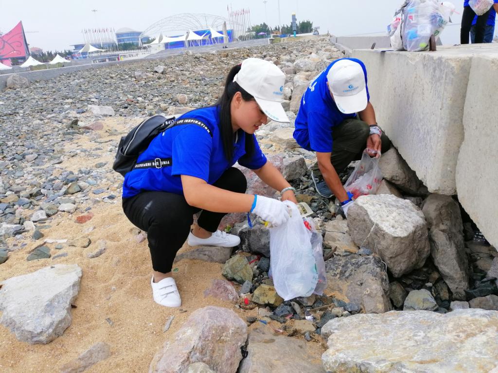 2018年9月15日,山东海事职业学院的35名志愿者参加了国际海洋环保潍坊分会场的海洋环境保护活动。志愿者们头戴白色帽子,身着蓝色T恤,整齐有序。活动中,志愿者们团结合作、不怕脏不怕累,将游客随手丢弃在沙滩上的烟盒、烟蒂、饮料瓶、塑料袋等一一捡了起来。